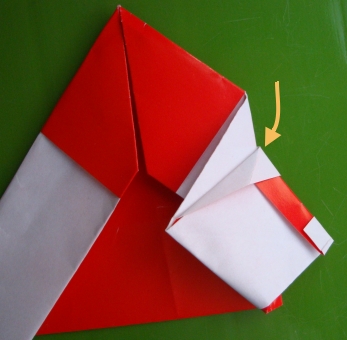 6.在上一步折叠的基础上,将上一步折叠所制作出来的新的边缘再向上进行一次翻折,这样就形成了如图所示的这只模型。可以看到,制作到这里还无法看出来我们制作的折纸圣诞老人的样子,不过不要着急,继续往下进行折叠制作。