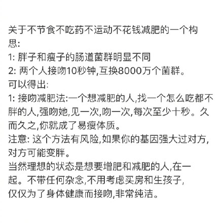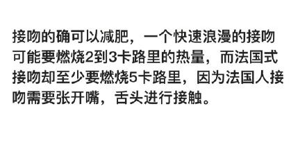 医学家测算,如果一个月接吻1000次,可减肥500克。每天三个吻,每个吻持续20秒,就能让你达到减轻体重的目的,还在等什么!